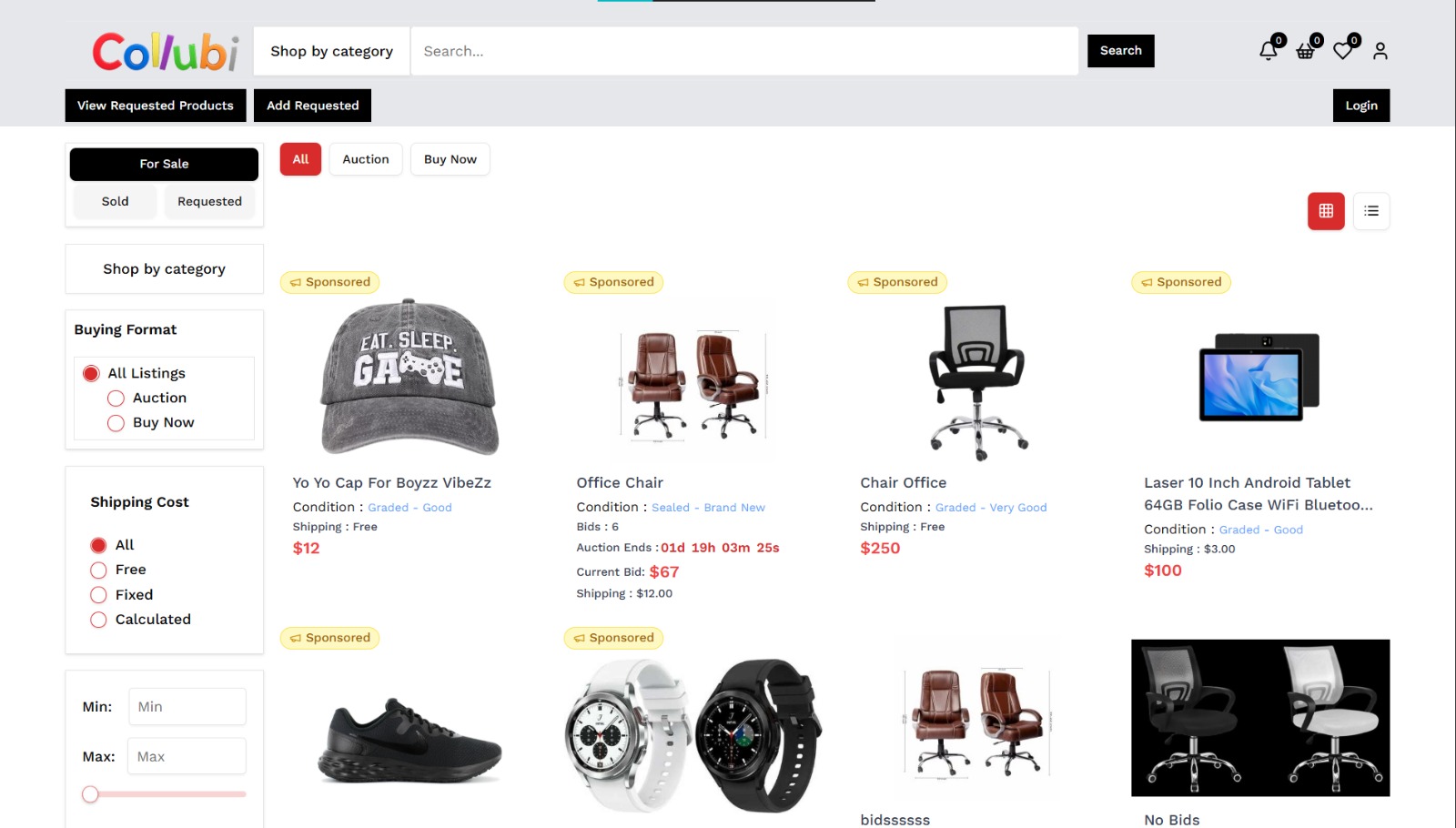 Collubi provides a hybrid marketplace with Buy Now products, live auction listings, sponsored product placements, graded condition labeling system, and mobile-friendly browsing. This creates a flexible and engaging shopping ecosystem.